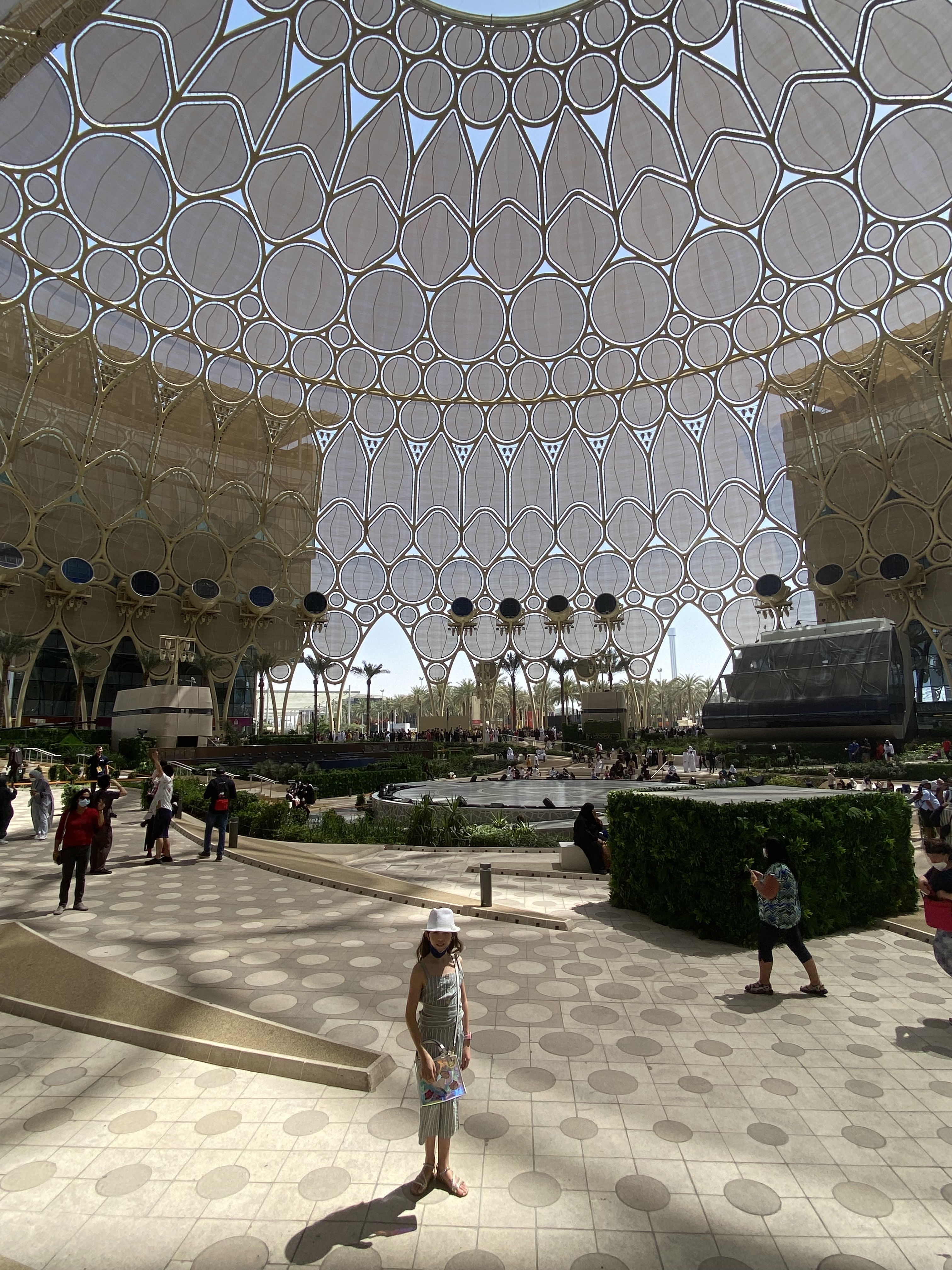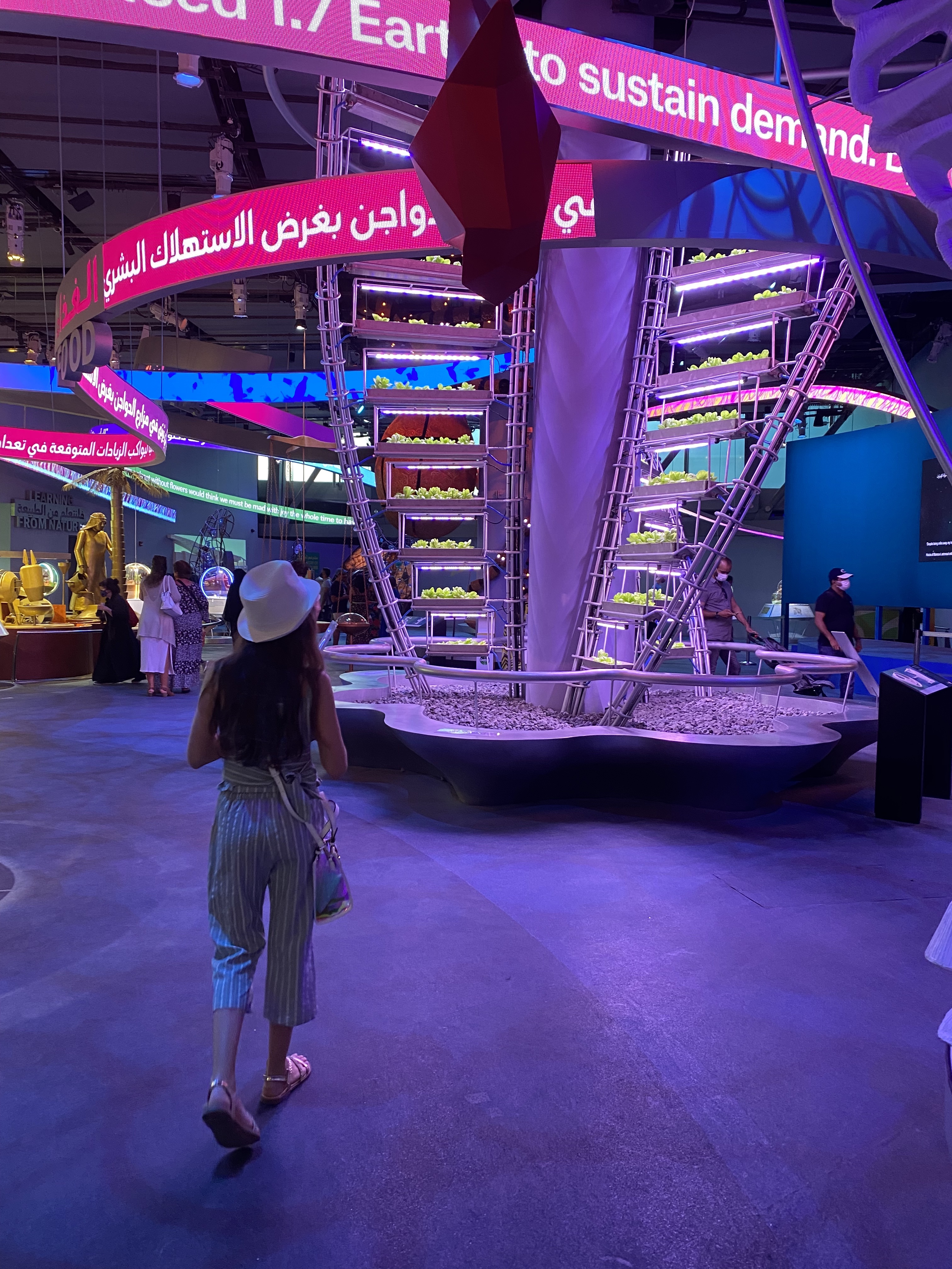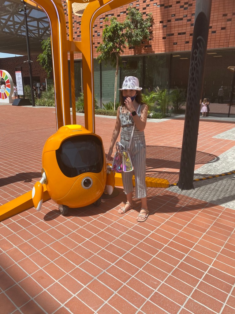 On fait un tour en véhicule à air compressé, on mange local (Hé oui! beaucoup de fermes à Dubaï), l’énergie du pavillon Terra est quasiment à 100% solaire, les goodies vendus comme par exemple une casquette sont tous recyclés, on peut se déplacer en vélo électrique, on insiste sur le fait de recharger vos bouteilles d’eau plutôt que d’en acheter des nouvelles grâce à des stations d’eau. (qui sont d’ailleurs présentes dans tout Dubaï).