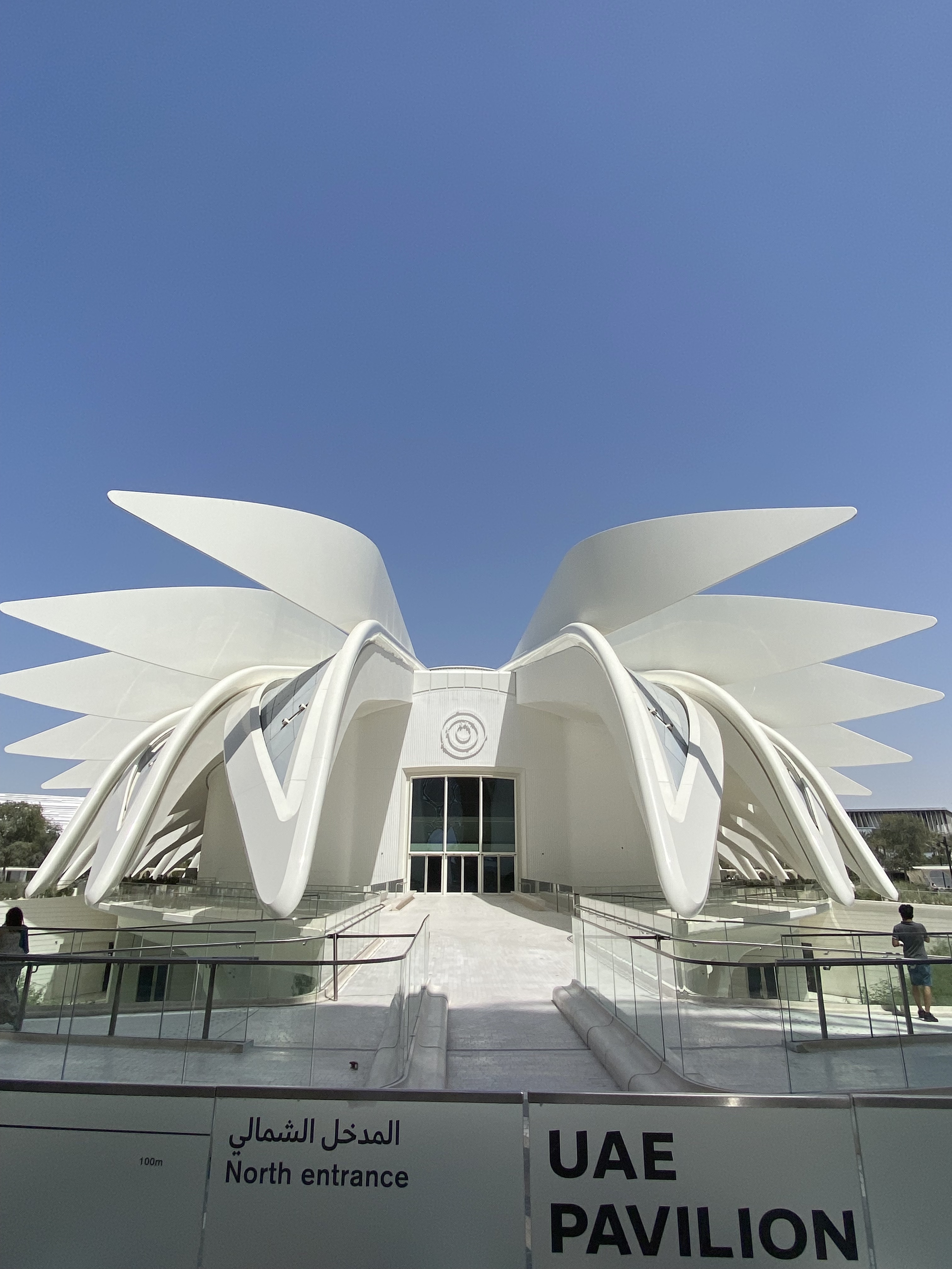 Une des 3 portes d’entrée de l’Expo, qui mêle le passé et le présent: des motifs de moucharabieh (cloison ajourée des pays arabes) fabriqués en mélange de fibre de carbone et de résine, filé en brins si fins qu’ils pourraient faire 5 000 fois le tour de la terre s’ils étaient disposés bout à bout.